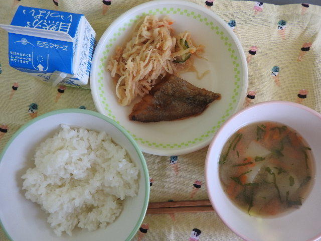 今日の給食は、むぎごはん、みそしる、いわしかぼすレモン煮、わふうサラダ、牛乳(600カロリー、たんぱく質21.6g)でした。今日の魚は「いわし」でした。主に体をつくる働きがありますが、他にも頭の働きをよくしたり、血液をサラサラにする働きがあるそうです。今日もとてもおいしくいただきました。