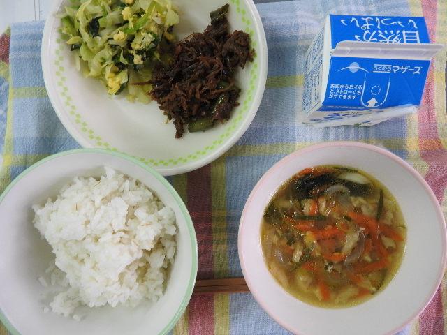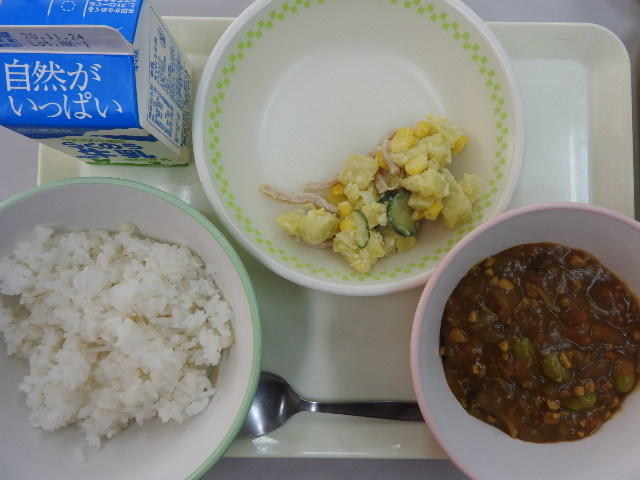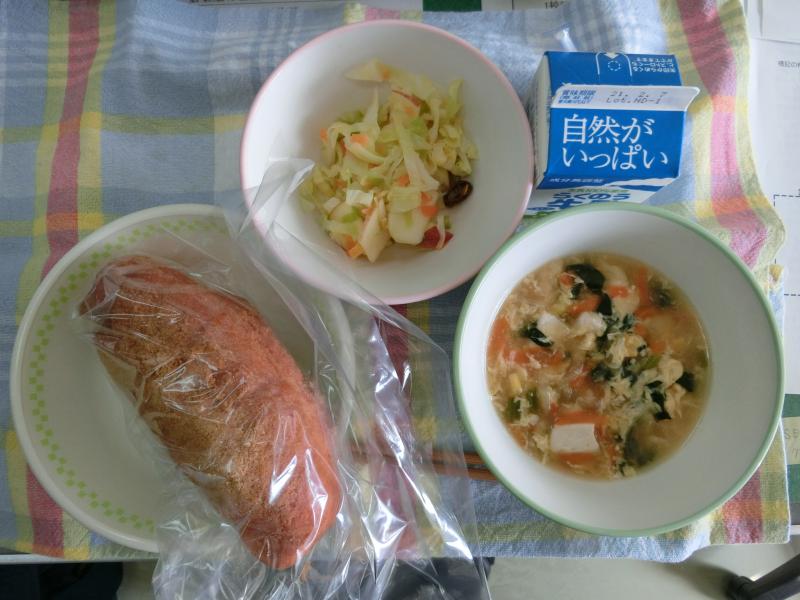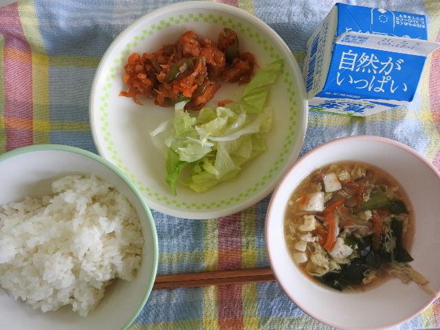 今日は、ごはん、青梗菜(チンゲンサイ)と卵のスープ、鶏肉のチリソース和え、レタス、牛乳 633㎉ タンパク質22.8g 今日は中華料理です。中国から伝わった青梗菜を使ったスープです。青梗菜は見た目は小松菜に似ていますが、白菜の仲間だそうです。(ほっかほっかニュースより)ほっかほっかニュースは勉強になりますね。子どもたちは、放送で聞いています。