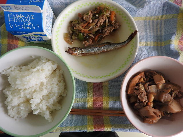 今日の給食のメニューは、文楽めし、さといものみそ汁、ししゃもフライ、にらのあえもの、牛乳(627カロリー、たんぱく質23.1g)でした。「文楽めし」とは、上益城郡山都町清和で昔から行われている清和文楽と呼ばれる人形浄瑠璃の芝居と芝居の間、幕間に食べられるごはんのことで、地域で収穫された大豆やしいたけ、山菜などをしょうゆやさとうで煮込み味をつけたものをご飯に混ぜてあります。清和の地域の恵みがぎっしりと詰まったごはんでした。(給食献立予定表 ひとくちメモより)