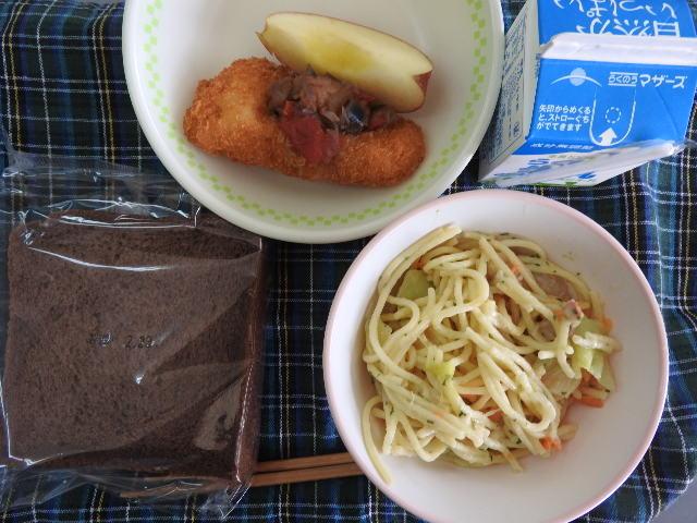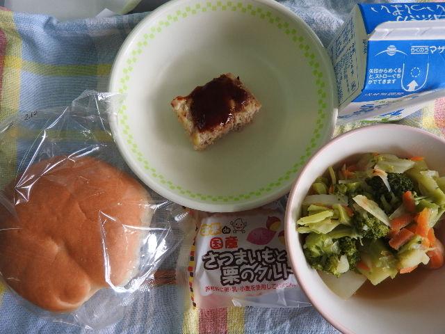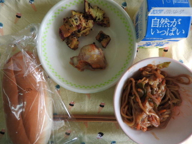 今日のメニューは、コッペパン、焼きそば、鶏肉のマーマレード焼き、大学芋、牛乳 657㎉ タンパク質26.4g パンに切れ目がありましたので、焼きそばパンにしていただきました。感謝!