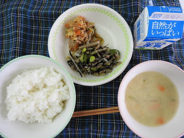今日のメニューは、ごはん、呉汁、肉野菜の卵とじ、ひじき和え、牛乳 685㎉ タンパク質24.4g