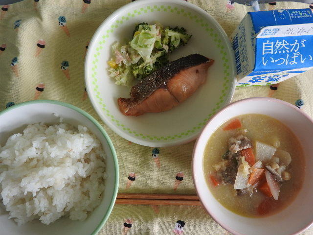 今日のメニューは、麦ごはん、豆乳豚汁、さけの塩焼き、ブロッコリーとツナのサラダ、牛乳 622㎉ タンパク質29.1g 豚汁は具だくさんでありがたいです。給食に日々感謝!
