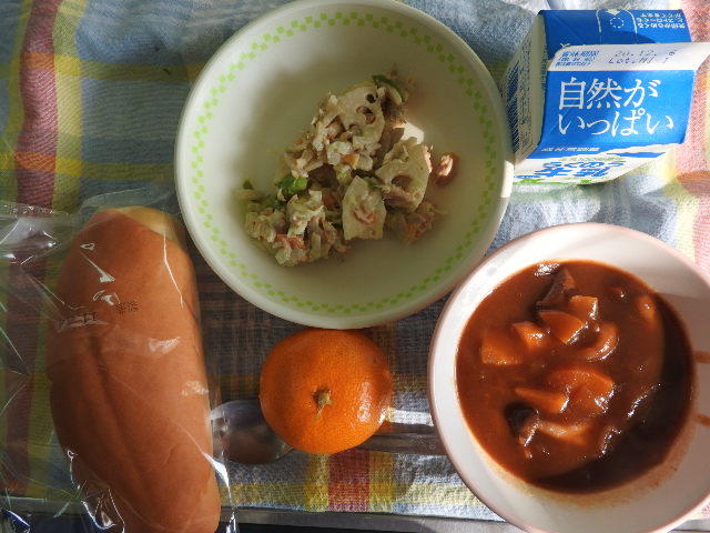 今日のメニューは、コッペパン、ビーフシチュー、牛乳、ごぼうとレンコンのサラダ、みかん 601㎉ タンパク質21.9g 見た目どおり、美味しいメニューでした。感謝。