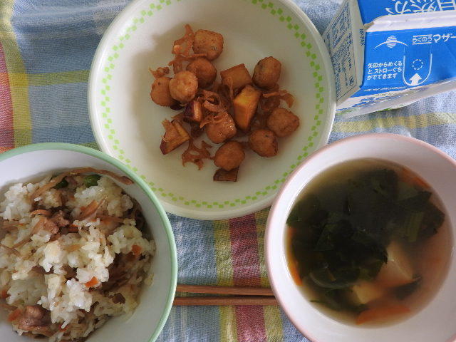 メニューは、栄養五色ご飯、すいとん、さつまいもと小魚の揚げに、牛乳 690㎉ タンパク質20.7g 栄養五色ご飯には、肉・さといも・大豆・人参が入っていました。ごちそうでした。感謝!