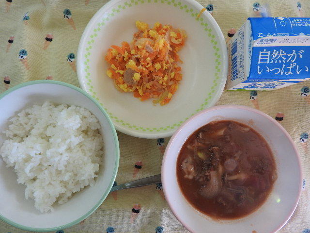 今日のメニューは、ごはん、ハッシュドビーフ、にんじんとツナのサラダ、牛乳 646㎉ タンパク質25.7g