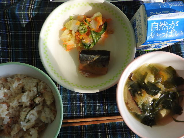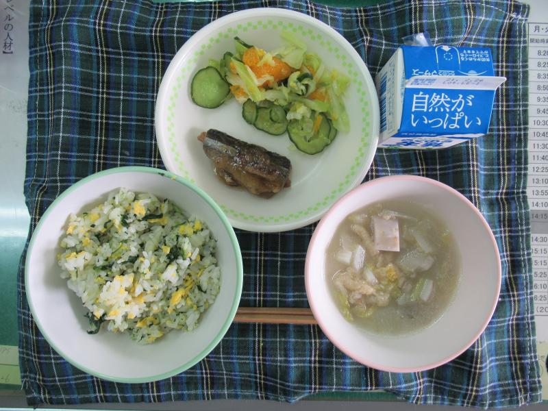 今日の給食は、菜の花ごはん、白菜のみそ汁、さんまのみそれ煮、みかんサラダ、牛乳(594カロリー、たんぱく質23.8g)でした。今日は、菜の花をイメージした「菜の花ごはん」でした。ほうれん草と炒り卵で菜の花が咲いているような彩りに仕上げてありました。ごちそうさまでした。