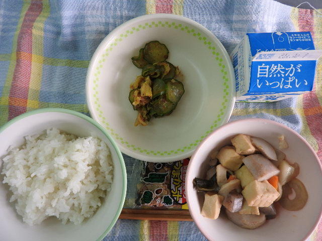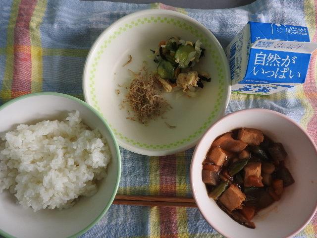 今日は、南関あげご飯、節そうめん汁、なすの中華炒め、納豆、牛乳 64㎉ タンパク質25.6g