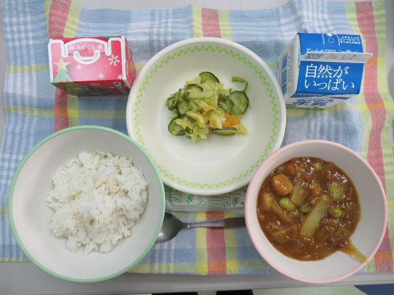 今日の給食は、チキンカレー、みかんドレッシングサラダ、クリスマスデザート、牛乳(656カロリー、たんぱく質19.4g)でした。今日はセレクト給食で、自分で選んだケーキが届きました。冬休み前最後の給食、とてもおいしくいただきました。