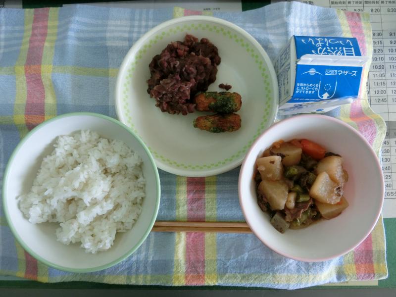 今日の給食は、むぎごはん、牛肉と大根のべっこう煮、ちくわのいそべあげ、あれかけだご、牛乳(698カロリー、たんぱく質22.9g)でした。「あれかけだご」は、南関町の郷土料理の一つで、小豆を甘く煮たものにもちを入れて混ぜたものです。今日は、南関そうめんの節が入っていました。とてもおいしくいただきました。