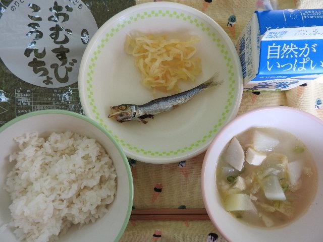 今日のメニューは、学校給食記念日にちなんだメニューでした。昨日、1月24日が学校給食記念日でした。今から、130年ほど前に山形県で始まったそうです。その時のメニューは、ごはんと焼き魚、漬け物だったそうです。(ほっかほっかニュースより)今日のメニューは、セルフおむすび、みそ汁、めざし、漬け物、牛乳 557㎉ タンパク質24.9g