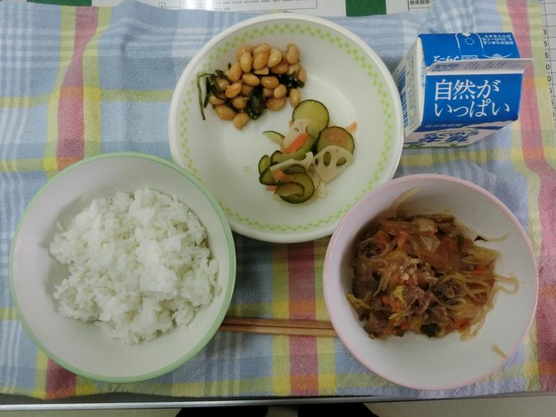 今日の給食は、麦ごはん、すきやき、ざぜん豆、きゅうりとレンコンの酢の物、牛乳(662カロリー、たんぱく質24.4g)でした。1回の食事あたり、野菜100g程度摂ることが大切だと言われていますが、今日のすきやきには、小学3・4年生でおよそ90gの野菜が入っているそうです。また、すき焼きに入っている牛肉は、熊本県からいただきました。今も新型コロナウイルス感染症対策として、生産者の生活を救うために行われているそうです。以上、ほっかほっかニュースからでした。