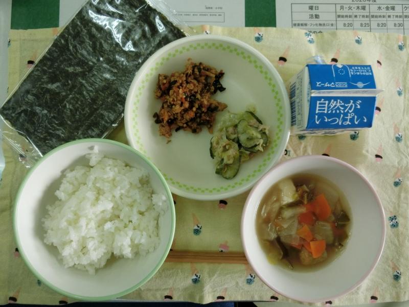 今日の給食は、セルフ手巻き寿司(ごはん、のり)、根菜つみれ汁、肉みそ、ツナのごまあえ、牛乳(633カロリー、たんぱく質24.7g)でした。今日は、2月6日の「海苔の日」に合わせて「セルフ手巻き寿司」でした。とてもおいしくいただきました。