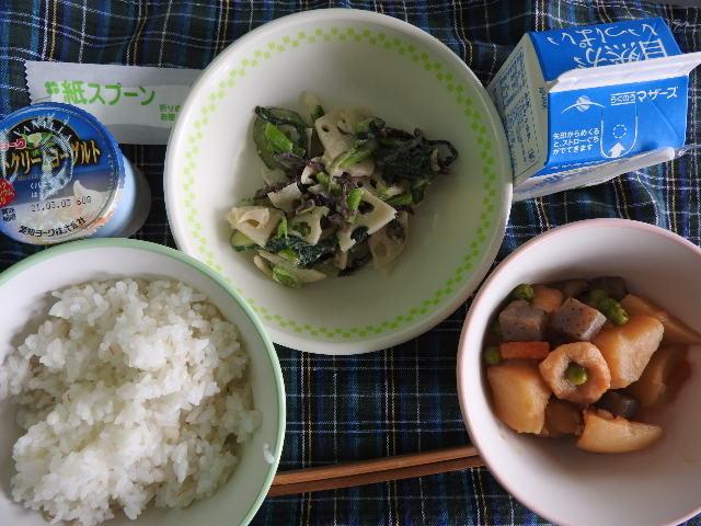 今日は、麦ごはん、じゃがいものうま煮、レンコンのごまダレ、ヨーグルト、牛乳 649㎉ タンパク質20.7g レンコンのしゃきしゃき感がとてもよく美味しく頂きました。