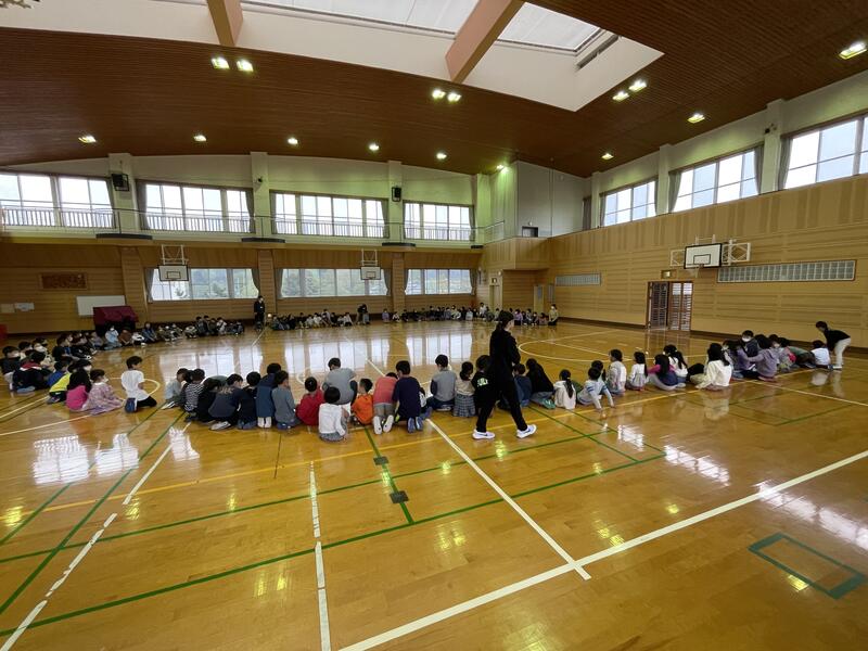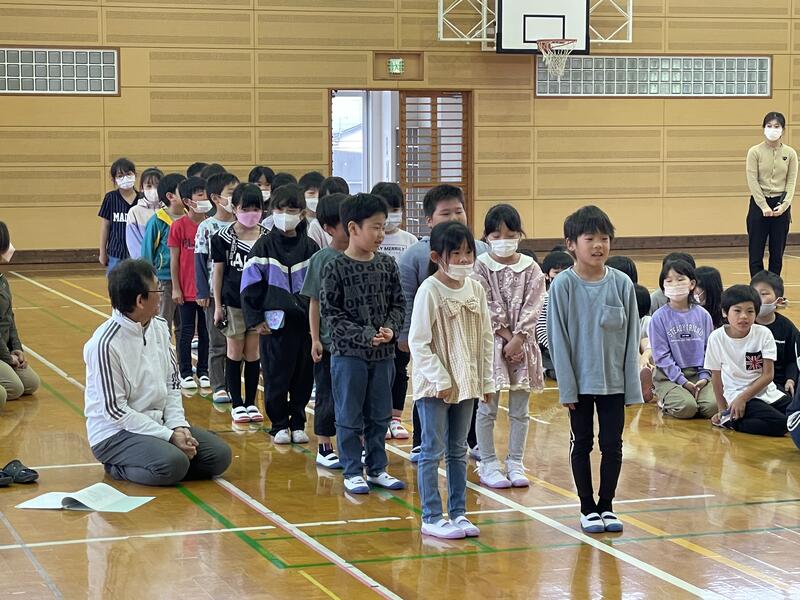 最後に、ボール投げ、幅跳び、高跳びと模範試技を披露していただきました。子供たちは、そのすごさ、見事さに自然と拍手が湧き上がりました。特に、高跳びでは170cmをはさみ跳びでクリアされ、大きな歓声が上がりました。