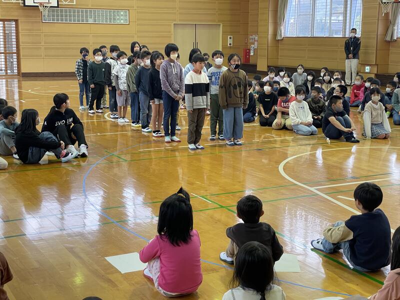 そして、いいところを4つあげました。それは、挨拶が上手になってきたこと、落ち葉集めなどよく働けるところ、「ありがとう」と言える子が増えてきたこと、学年をこえて男女一緒に遊べるところです。後期もぜひ続けて頑張ってほしいと思います。