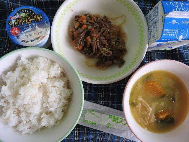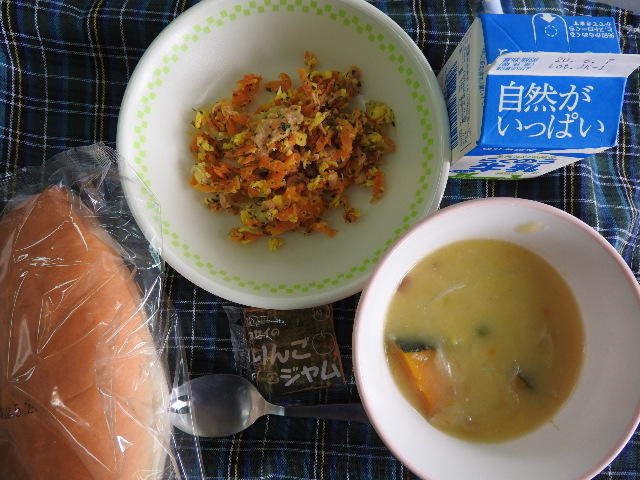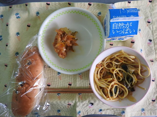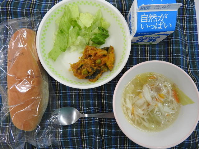 今日のメニューは、コッペパン、牛乳、ふしそうめんスープ、かぼちゃのミートソース、レタス 566㎉タンパク質19.8g