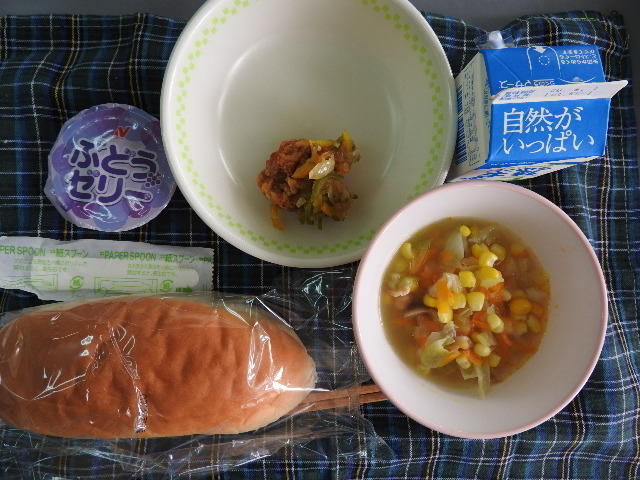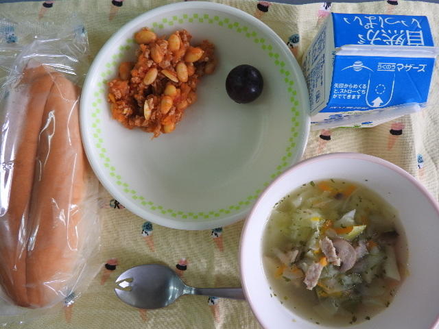 今日のメニューは、コッペパン、牛乳、チリコンカン、野菜スープ、ぶどう 554㎉ タンパク質23.7g