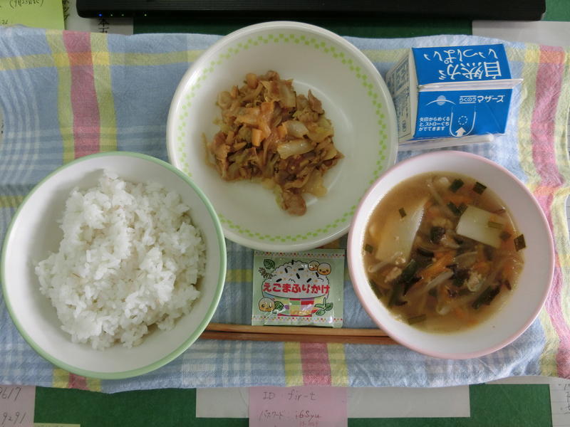 今日のメニューは、麦ごはん、ワンタンスープ、ホイコーロー、ふりかけ、牛乳(557カロリー、たんぱく質19.1g)でした。とてもおいしくいただきました。