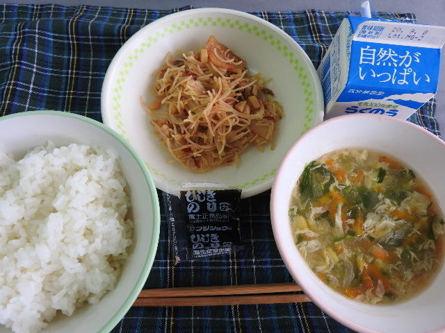 今日のメニューは、ごはん、焼きビーフン、コーン入り中華スープ、ひじきのり、牛乳 578㎉ タンパク質21.7g 感謝!