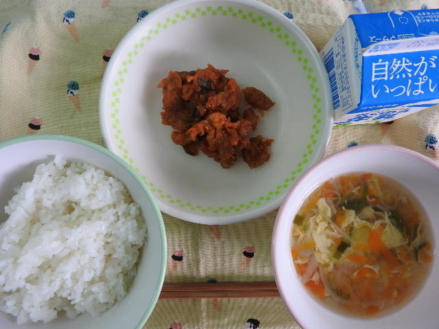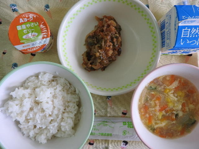 本日のメニューは、ごはん、昆布入り中華スープ、鶏肉のチリソース、牛乳 635㎉ タンパク質21.1g 鶏肉のチリソースと並んでいるせいか、地元南関米の「白さ」が際だっていたように感じました。感謝!