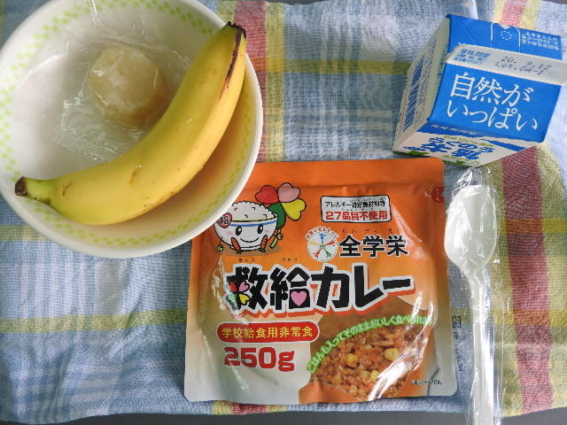 今日は9月1日 防災の日です。メニューは、救急カレー、いきなりだんご、バナナ、牛乳 502㎉ タンパク質10.4g