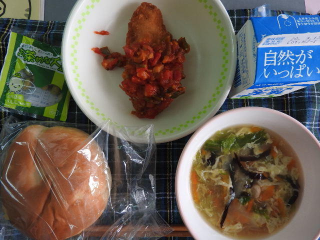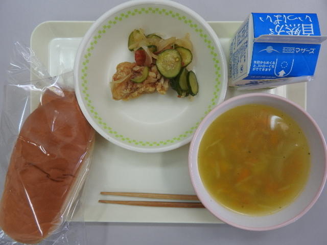コッペパン、牛乳、コンソメスープ、チキン南蛮、デザート 614㎉ タンパク質26.6g