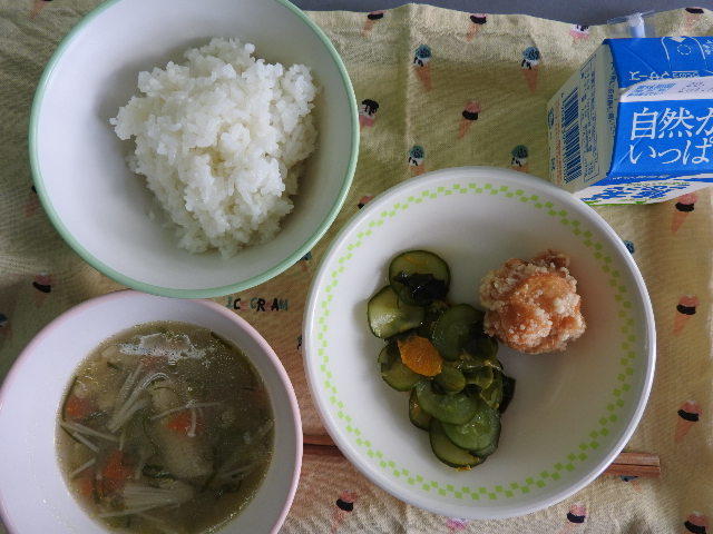 今日のメニューは、ごはん、冬瓜(とうがん)とかぼちゃのみそ汁、とりの唐揚げ、きゅうりとみかんの酢の物、牛乳 649㎉、タンパク質22.4g 毎日おいしくいただいています。感謝!