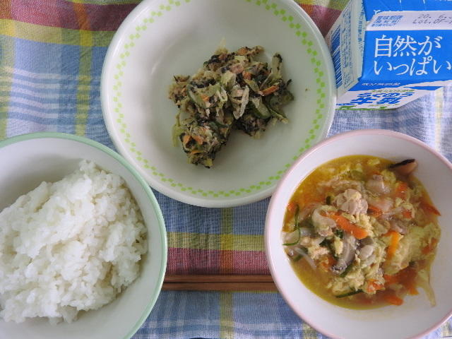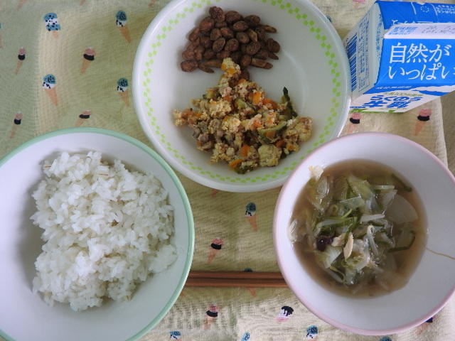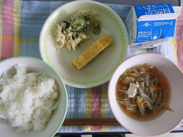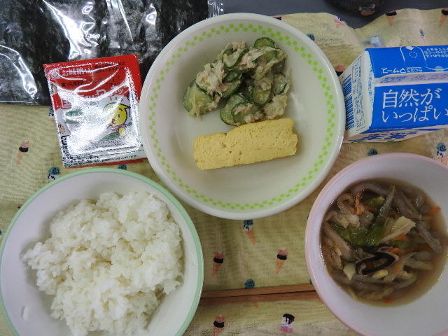 今日のメニューは、手巻きごはん、五目汁、卵焼き、ツナのごま和え、納豆、海苔、牛乳 652㎉ タンパク質24.8g 今日はとっぱ丸の日そして7月10日でなっとうの日にちなんだメニューでした。感謝!
