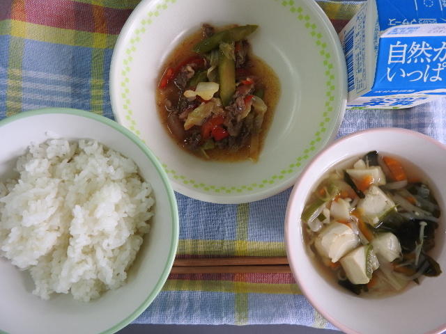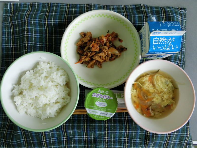 今日のメニューは、麦ごはん、スーミータン、麻婆なす、野菜ゼリー、牛乳 586㎉ タンパク質18.1g。明日から9月ですが、まだまだ暑い日が続きます。暑さに負けないように、早寝・早起き・朝ごはんを心がけ、そしておいしい給食を食べて、体調を整えましょう。