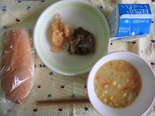今日のメニューは、コッペパン、牛乳、コーンポタージュ、ハンバーグの甘酢和え、れんこんチップス、605㎉ タンパク質21.1g 今日もおいしくいただきました。昨日は出張のため、給食を食べることができませんでした。昨日のHPを見て、とても残念な気持ちになりました。次回、同じメニューが出る日を楽しみに待ちます。いつかな?