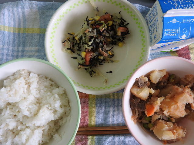 今日のメニューは、麦ごはん、じゃがいものうま煮、ピーマンのじゃこ和え、牛乳 556㎉ タンパク質19.9g 今日もおいしく感謝しながらいただきました。