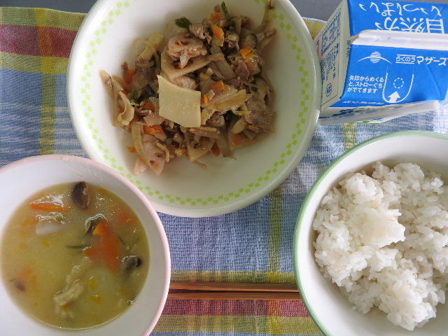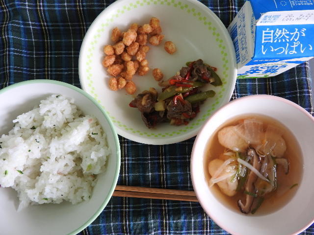 本日のメニューは、山菜ごはん、こさんだけのみそ汁、とりのからあげ、牛乳 655㎉,タンパク質24.3g 「こさんだけ」を調べてみたところ、マダケに属する竹(布袋竹=ホテイチク)で、鹿児島では「こさんだけ」と呼ばれるそうです。