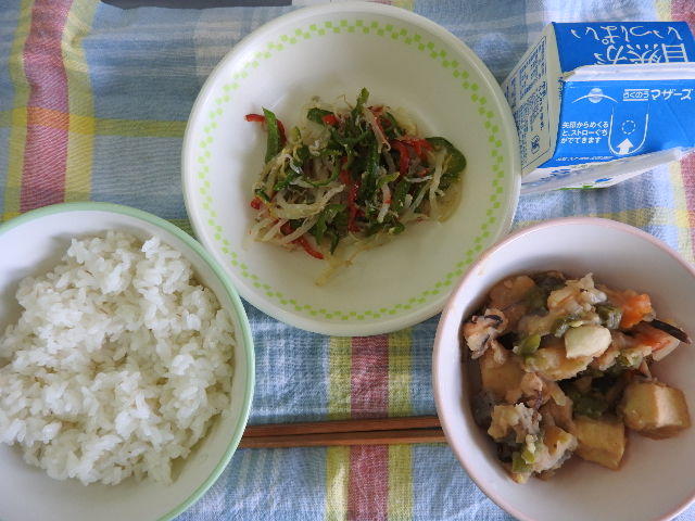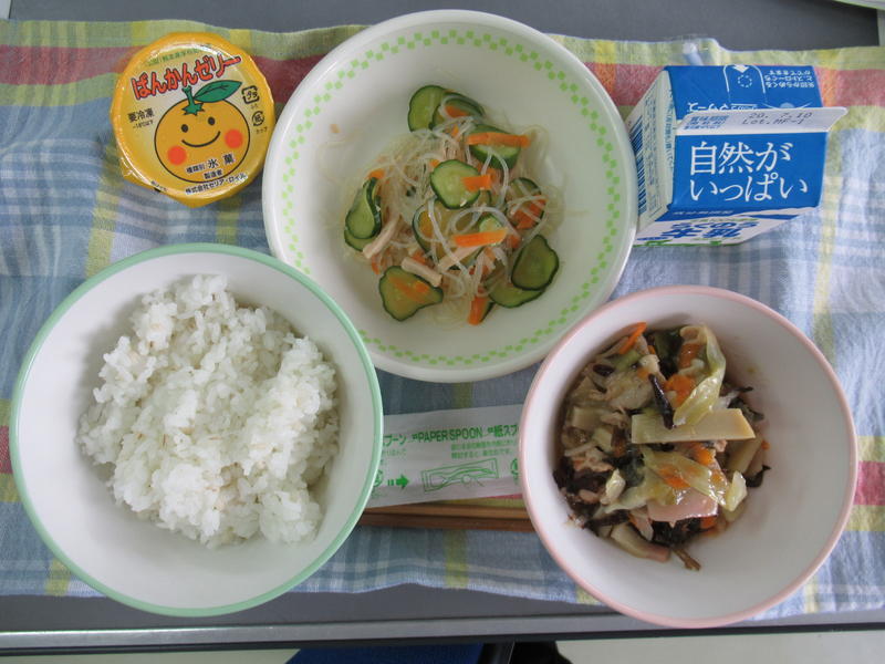 本日のメニューは、わかめご飯、たけのこのうま煮、スパゲティサラダ、牛乳 642㎉ タンパク質21.7g 暑くなってきて給食センターの調理場も大変な暑さだと思います。心から感謝申し上げます。