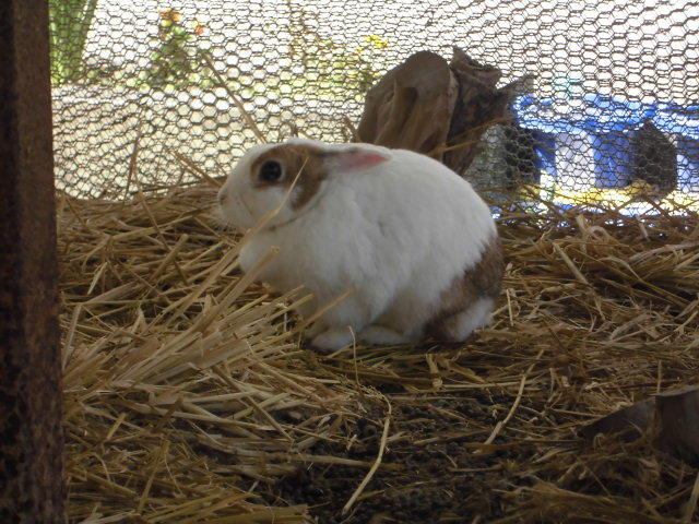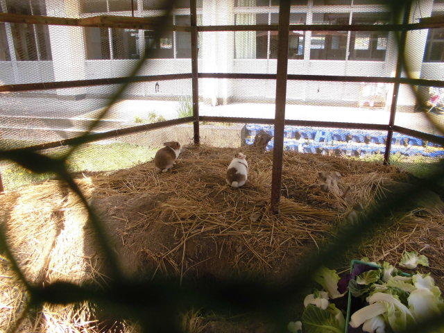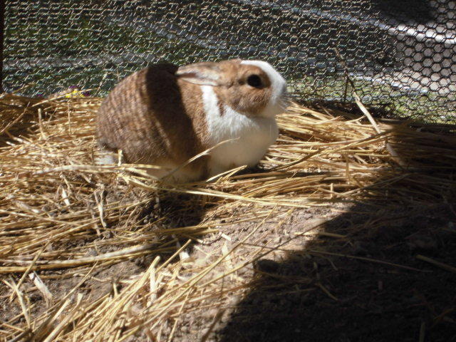 画像は、えさを食べた後、ゆっくり休んでいるうさぎさんです。いきいき村さんより野菜の葉っぱをいただきました。