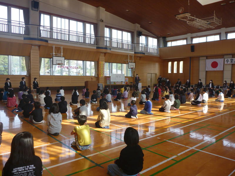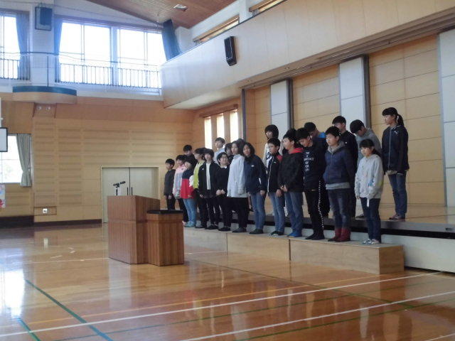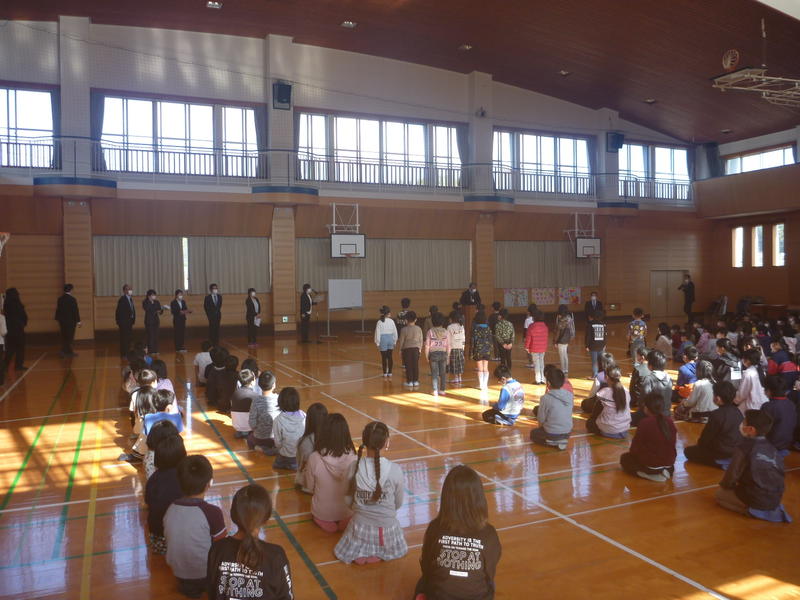今日は、朝、始業前から行った卒業式の練習と1時間目に行った修了式の様子をアップします。修了式では、全員マスクを着用し、体育館いっぱいに広がり、2階の窓と出入り口を開け換気をして実施しました。