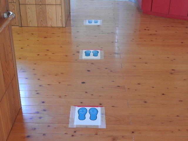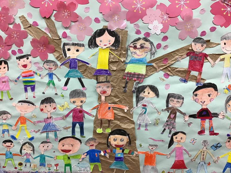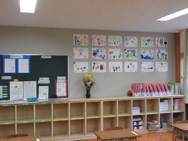 どの教室も、5月7日の学校再開に備えて、きれいに整理されていました。1年生教室には、小学校に入学して初めて描いた絵が掲示されていました。5月7日の学校再開で、みんなと会えるのを絵も楽しみにしているようです。