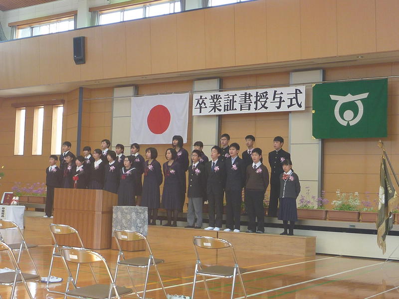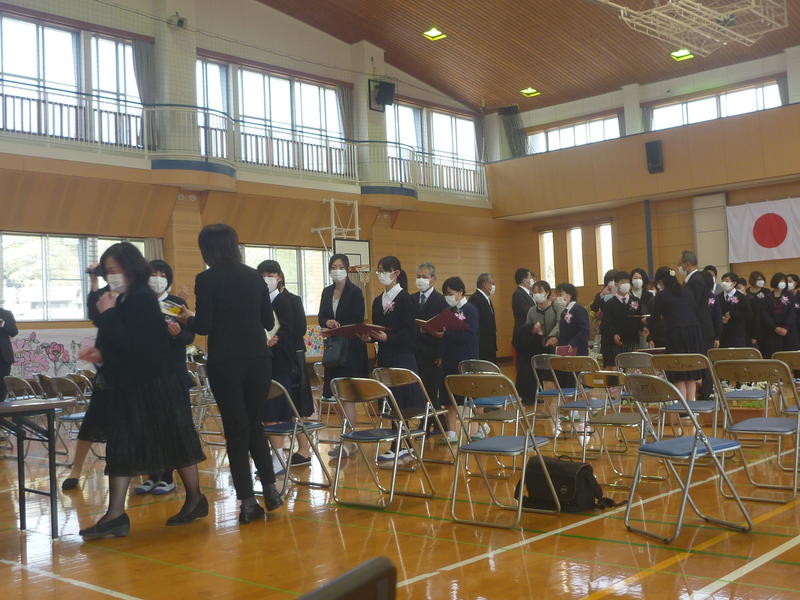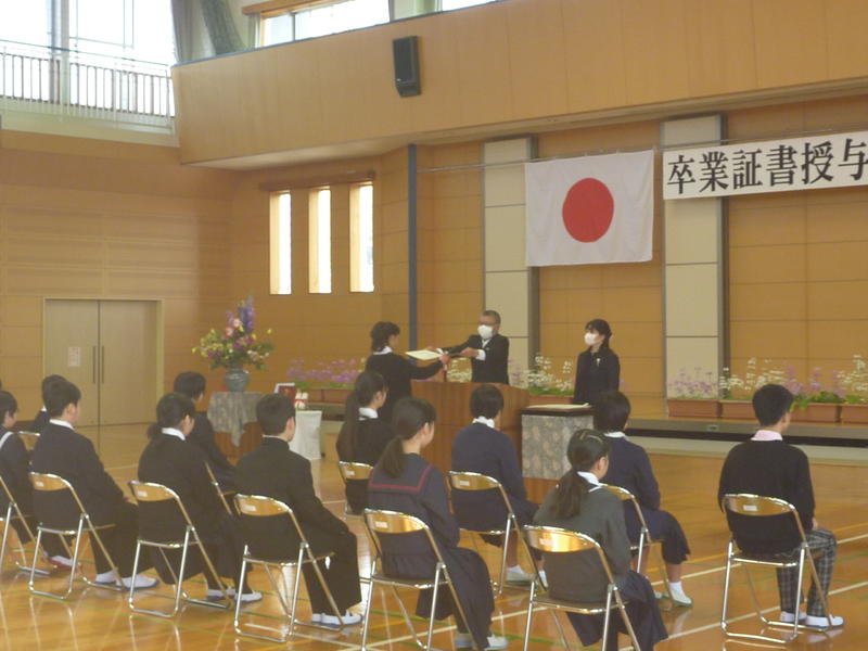 本日、無事卒業証書授与式を挙行することができました。感染拡大防止のため、卒業生と保護者・学校関係者だけでの卒業式でしたが、「最少人数で最高の思い出になる卒業式」をテーマに全職員で準備を進めてきました。卒業生24名の健康と今後益々の活躍を祈ります。画像は、体育館壁面の飾りと卒業式の様子です。