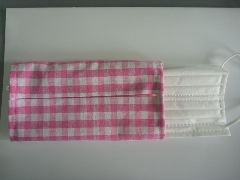 本校職員が、マスクカバーを作成しました。紙マスクを覆うことができるカバーです。