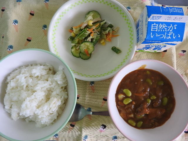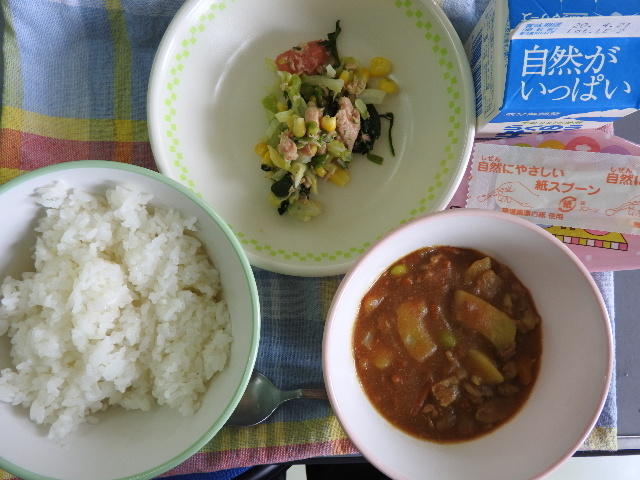 本日のメニューは、カレーライス、インゲンのマヨネーズ和え、牛乳 643㎉ タンパク質20.8g