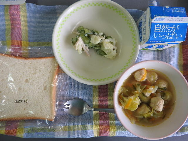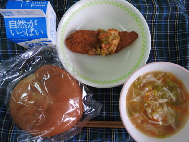 給食の後、12時40分を目処に下校します。職員も下校に同行します。下校後は、外出等を控え、家庭で過ごさせてください。今日のメニューは、パインパン、牛乳、レタスと卵のスープ、魚のミラノ風カツレツ、お茶めな豆 621㎉ タンパク質25.6g