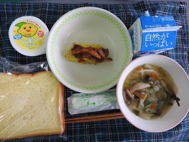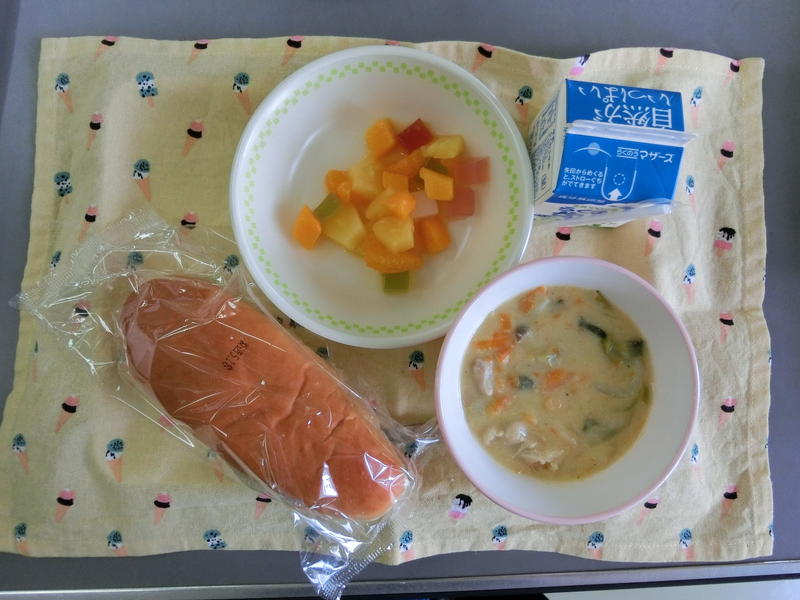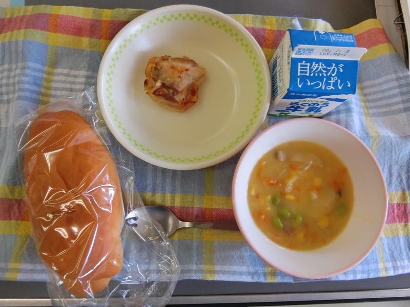 今日のメニューは、コッペパン、きのこのポタージュ、鶏肉のマーマレード焼き、牛乳(635カロリー、たんぱく質27.7g)でした。今日もおいしくいただきました。