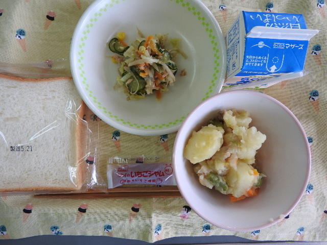 本日のメニューは、食パン、いちごジャム、牛乳、じゃがいものベーコン煮、ごまドレッシングサラダ
