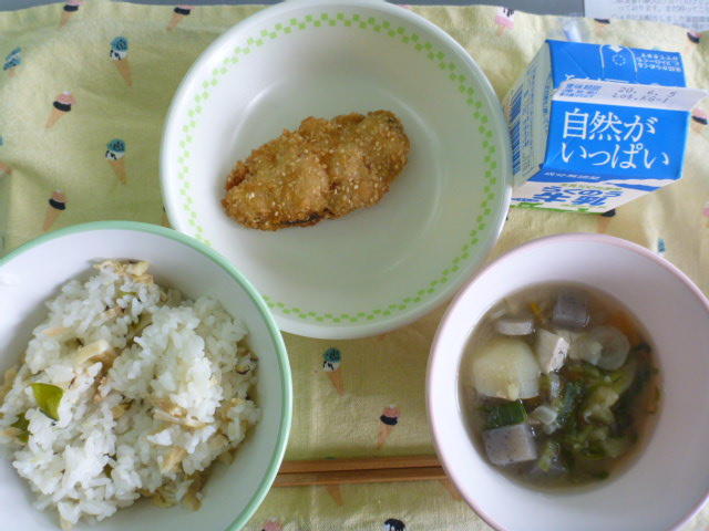 本日のメニューは、たけのこごはん、みそ汁、あじごまフライ、牛乳 570㎉ タンパク質21g