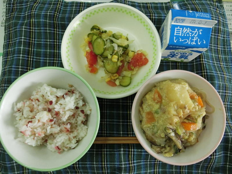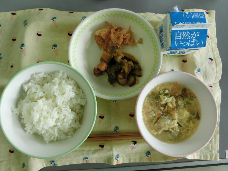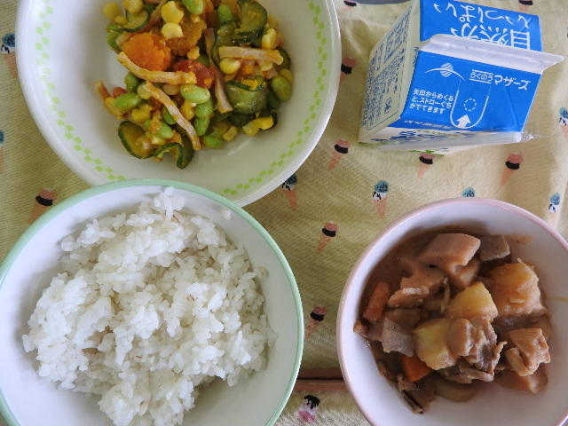 今日のメニューは、枝豆ごはん、かぼちゃのそぼろ煮、ビーフンサラダ、牛乳(630カロリー、23.4カロリー)でした。ご馳走様でした。