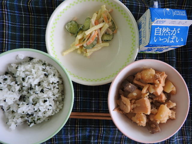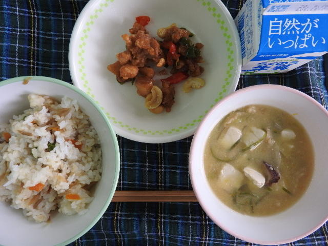 本日のメニューは、混ぜごはん、豆乳入りみそ汁、鶏肉のカシューナッツ和え、牛乳 714㎉ タンパク質24.7g 梅雨の時期、元気がでる給食に感謝!