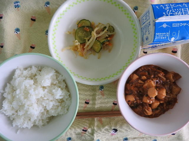 本日のメニューは、ごはん、マーボー豆腐、中華和え、牛乳 564㎉ タンパク質19.7g