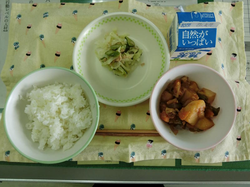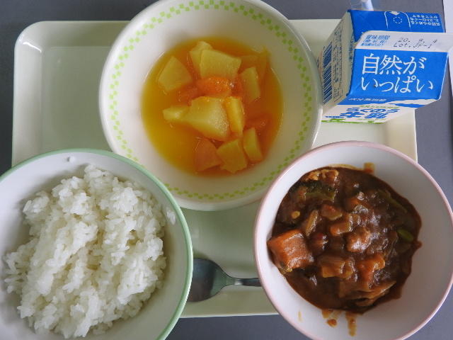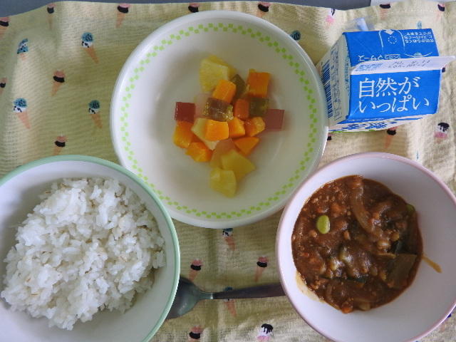 今日のメニューは、夏野菜カレー、フルーツミックス、牛乳 669㎉ タンパク質17.9g 暑い調理場において、例年よりも7~8回多い給食を提供していただきましたことに感謝します。夏野菜カレーには、かぼちゃ、なす、ゴーヤなどが使われていました。
