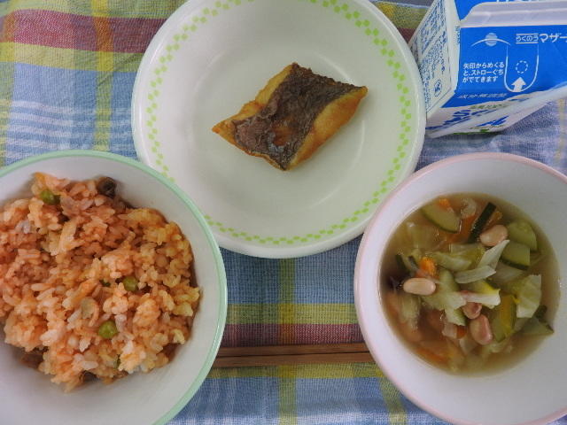 本日のメニューは、チキンライス、ビーンズスープ、魚のレモン煮、牛乳 603㎉ タンパク質23.8g