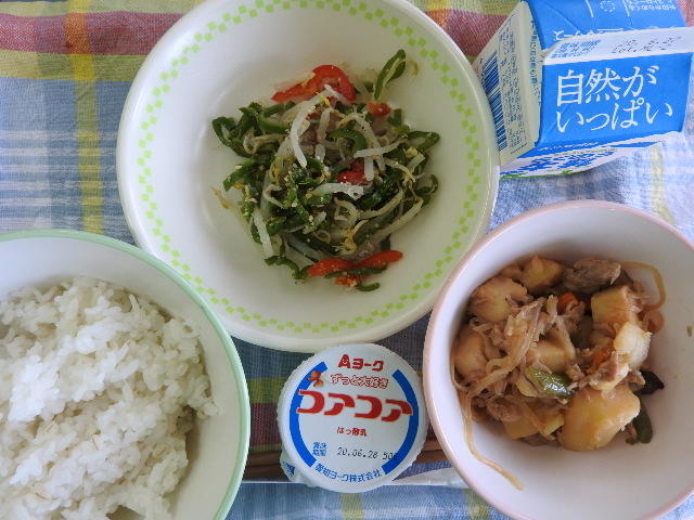本日のメニューは、麦ごはん、豚肉と新じゃがの煮物、ピーマンのじゃこ和え、ヨーグルト、牛乳 635㎉ タンパク質24.6g 煮物は新じゃがらしい味で、おいしくいただきました。感謝!