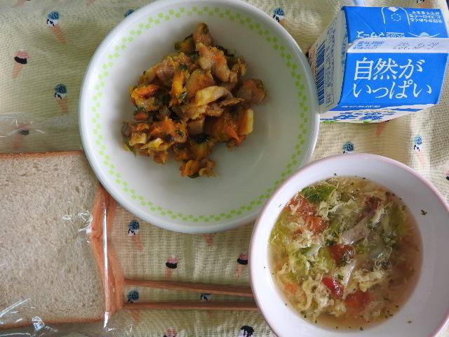 本日のメニューは、黒糖パン、牛乳、トマトと卵のスープ、鶏肉とカボチャの中華いため 654㎉ タンパク質27.1g